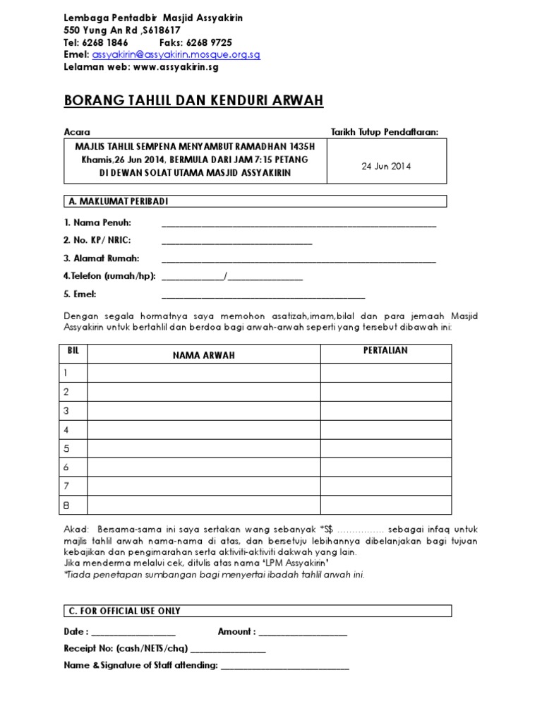 Borang Tahlil Doa Selamat 2014