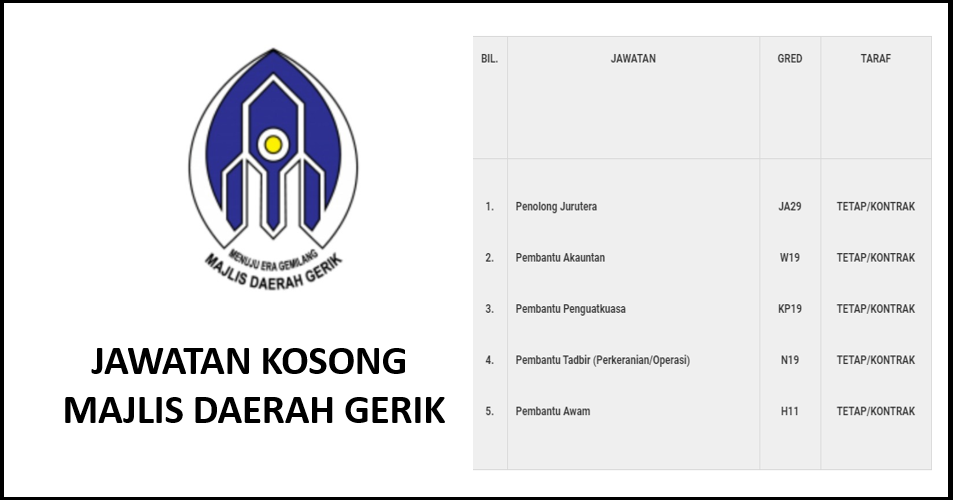 Kindly click here to see the complete advertisement. Jawatan kosong kerajaan dan swasta published. Permohonan hendaklah menggunakan aplikasi atas talian online sahaja dengan melayari laman web majlis daerah gerik di www gerik gov my. Pembantu penilaian w19 tarikh tutup permohonan.