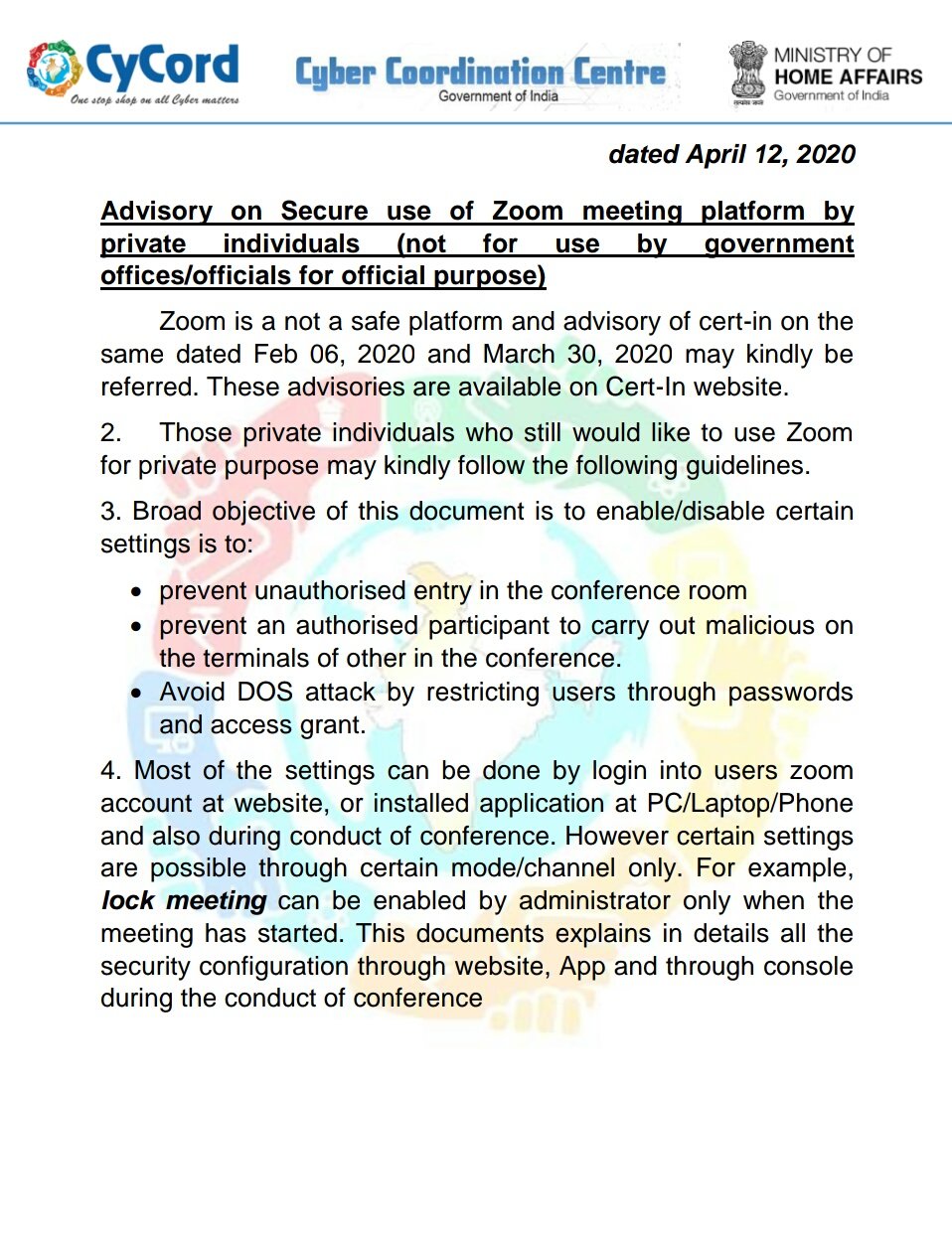 Spokesperson Ministry Of Home Affairs On Twitter Mha Issues Advisory On Secure Use Of Zoom Meeting Platform Platform Not For Use By Government Officers Officials For Official Purposes Guidelines To Safeguard Private Individuals